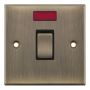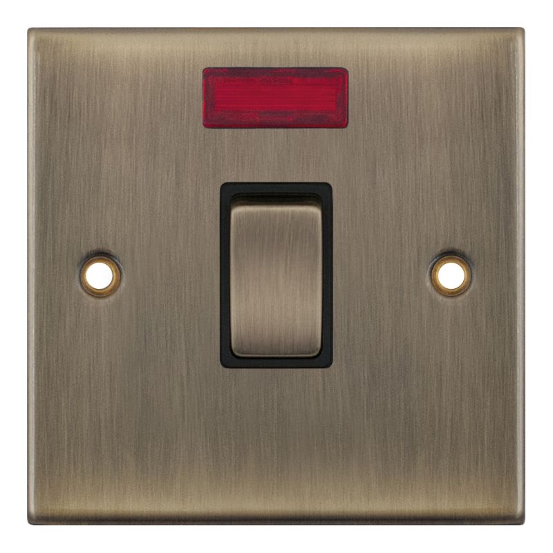 This is the Selectric 20 Amp Double Pole Switch with Neon in an Antique Brass finish with black insert. It features an optional cable outlet located on the inside of the faceplate for flexible installation. As antique brass is finished by hand, minor variations in colour are to be expected. A minimum back box depth of 25mm is required for installation.