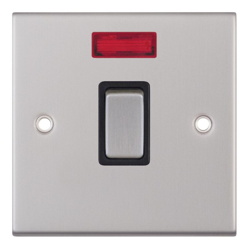 The Selectric 20 Amp DP Switch with Neon in satin chrome with black insert is designed for reliable control of higher load electrical circuits. Featuring a built-in neon indicator for clear power status visibility, it combines practical functionality with a sleek, modern finish. The switch requires a minimum 25mm back box for installation.