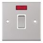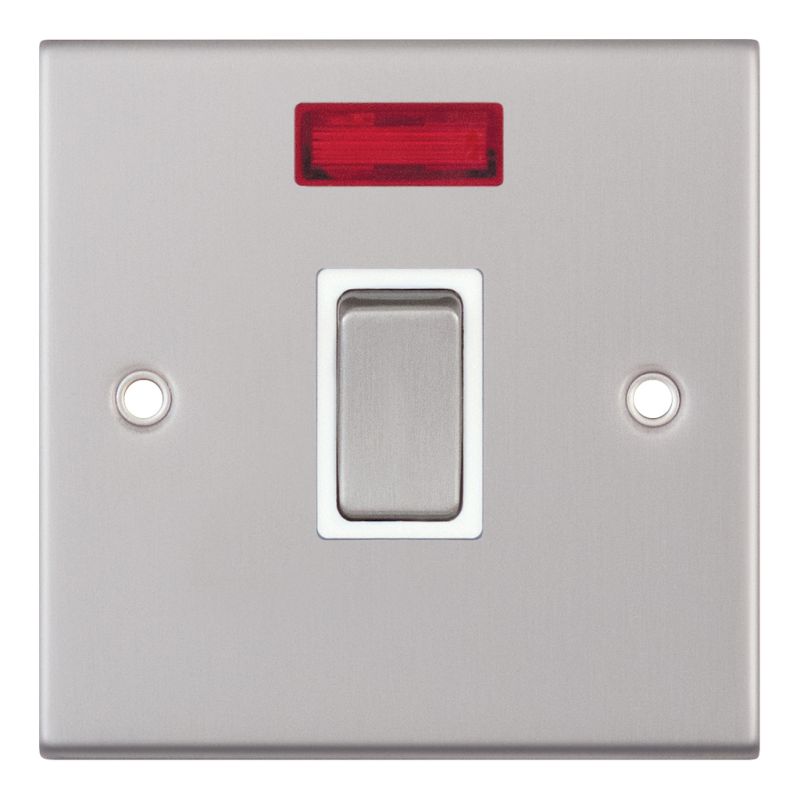 The Selectric 20 Amp DP Switch with Neon in satin chrome with white insert is designed for reliable control of higher load electrical circuits. Featuring an integrated neon indicator for clear visibility of power status, it combines practical functionality with a sleek, modern finish and requires a minimum 25mm back box for installation.