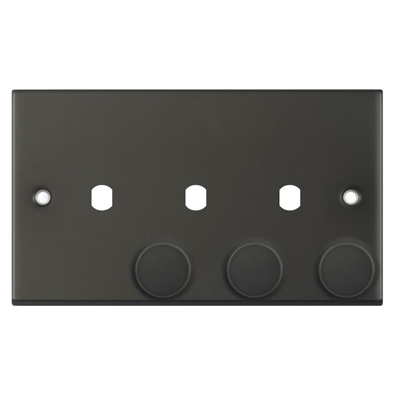 The Selectric 3 Aperture Empty Dimmer Plate in dark bronze is a triple-opening frame designed for personalized lighting setups. It comes equipped with three matching control knobs, allowing for the installation of up to three independent dimmer modules within a single plate.