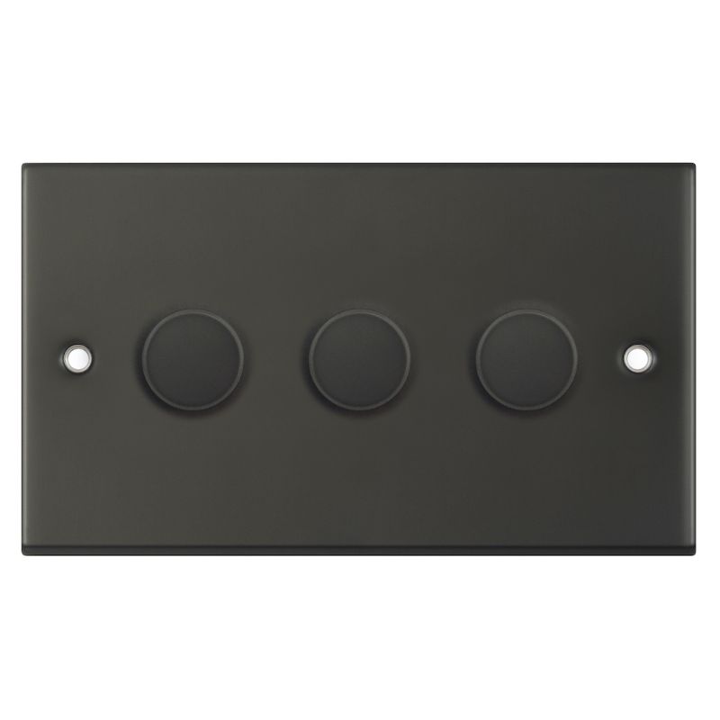 The Selectric 3 Gang 2 Way Dimmer Switch in dark bronze features a push on/off mechanism that provides independent control for three separate lighting circuits. It utilizes advanced technology to provide a smooth dimming range and is specifically designed to eliminate flickering at maximum brightness levels.