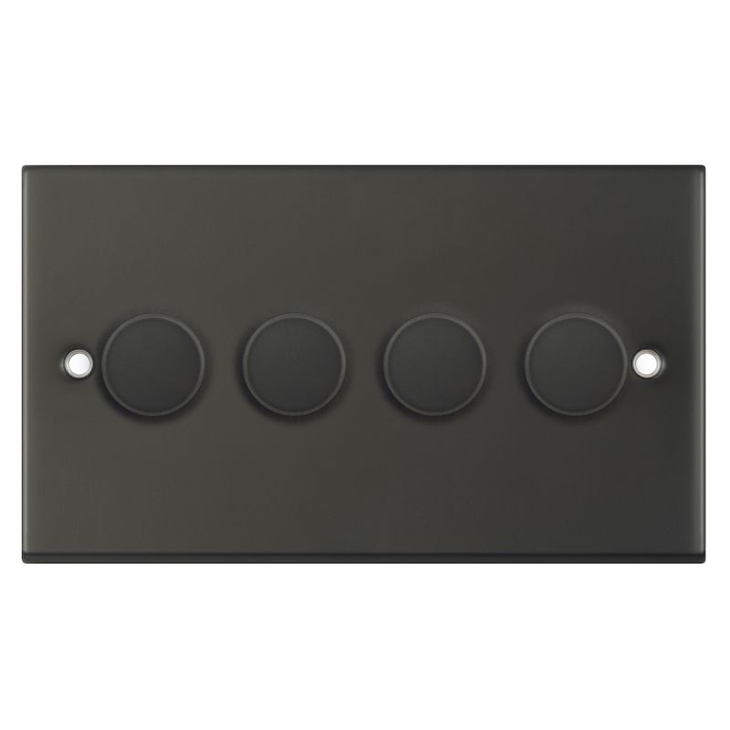The Selectric 4 Gang 2 Way Dimmer Switch in dark bronze features a push on/off mechanism that allows for the independent control and dimming of four separate lighting circuits. It is engineered with modern technology to ensure a smooth dimming range and is specifically designed to prevent flickering at maximum brightness levels.