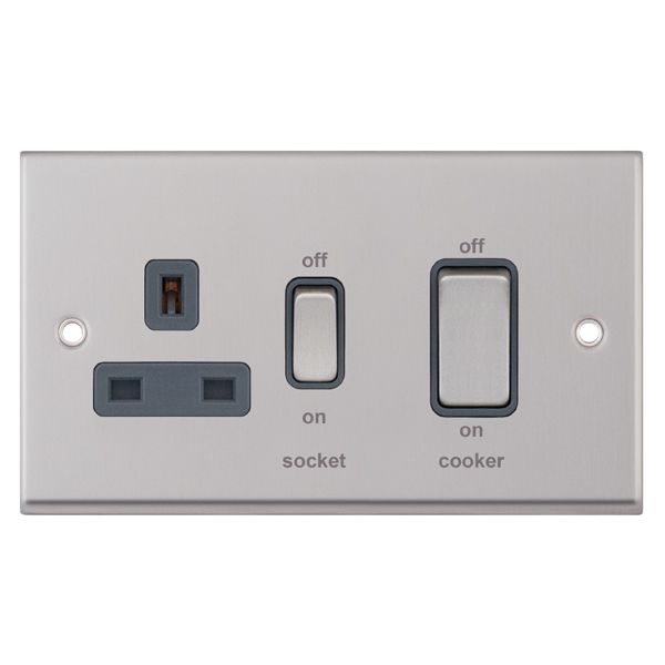 45 Amp Cooker Unit w/ 13 Amp Switched Socket Grey Inserts Selectric Sockets Satin Chrome