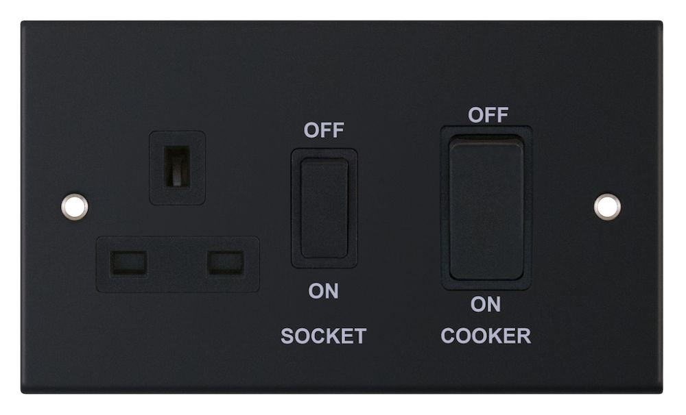 - Colour: Matt black with matching metal rockers & black insert – Marked “OFF / ON SOCKET” “OFF / ON COOKER”