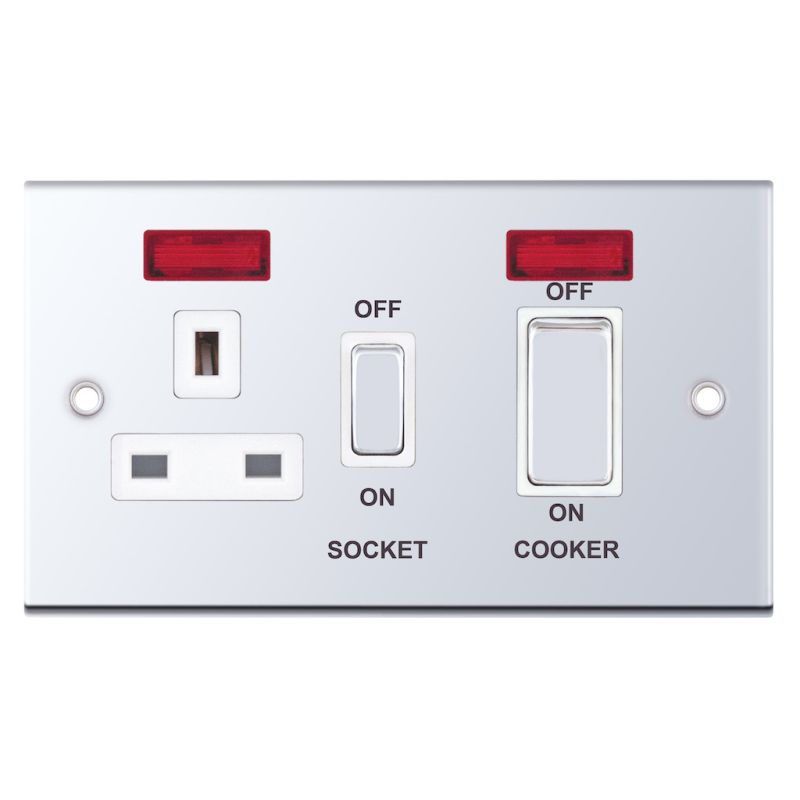 45 Amp Cooker Unit with 13 Amp Switched Socket & Neons White Insert Selectric Cooker Switches Polished Chrome
