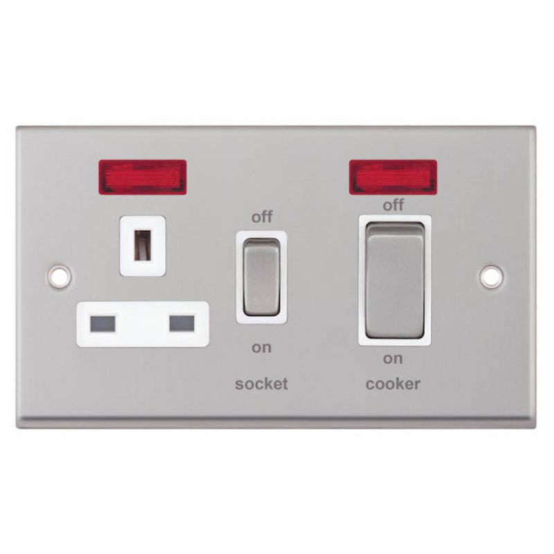 45 Amp Cooker Unit with 13 Amp Switched Socket & Neons Selectric Sockets Satin Chrome