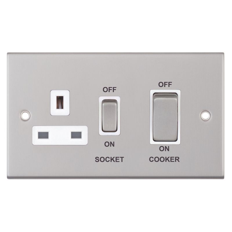 45 Amp Cooker Unit with 13 Amp Switched Socket White Insert Selectric Cooker Switches Satin Chrome