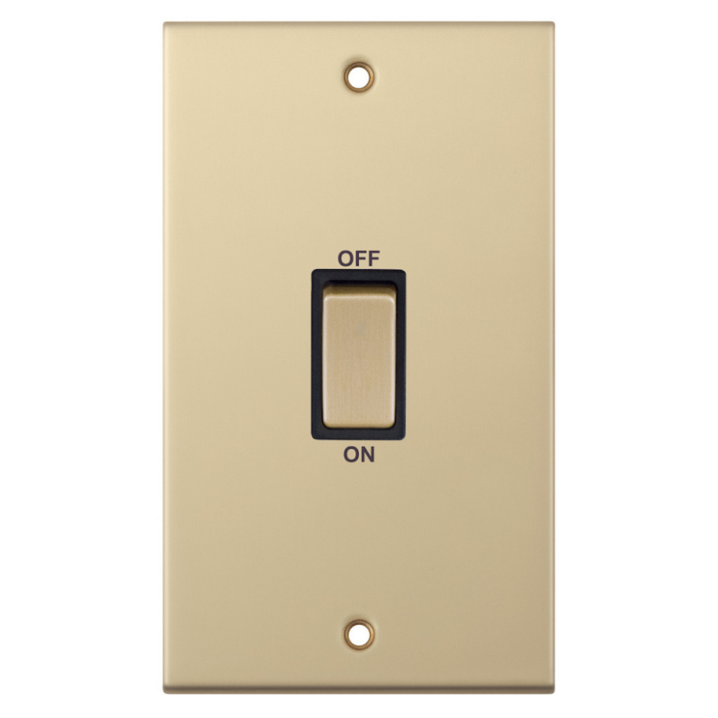The Selectric 45 Amp DP Switch 2 Gang Plate in Satin Brass is designed for the safe and reliable control of high-load domestic, commercial, and industrial appliances such as cookers and heater units. Built for higher current applications, it offers dependable double-pole switching while maintaining a refined, premium appearance. An optional cable outlet located on the inside of the faceplate provides added installation flexibility. With a minimum back box depth requirement of 47mm, this switch ensures secure fitting and long-lasting performance.