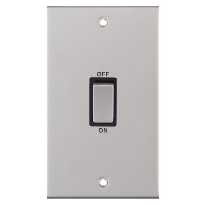The Selectric 45 Amp DP Switch 2 Gang Plate in satin chrome with black insert is designed for high-current applications in domestic, commercial, and industrial settings, such as cookers and heater units. Featuring an optional cable outlet located on the inside of the face plate, it offers practical functionality with a sleek, modern finish. The unit requires a minimum 47mm back box for installation.