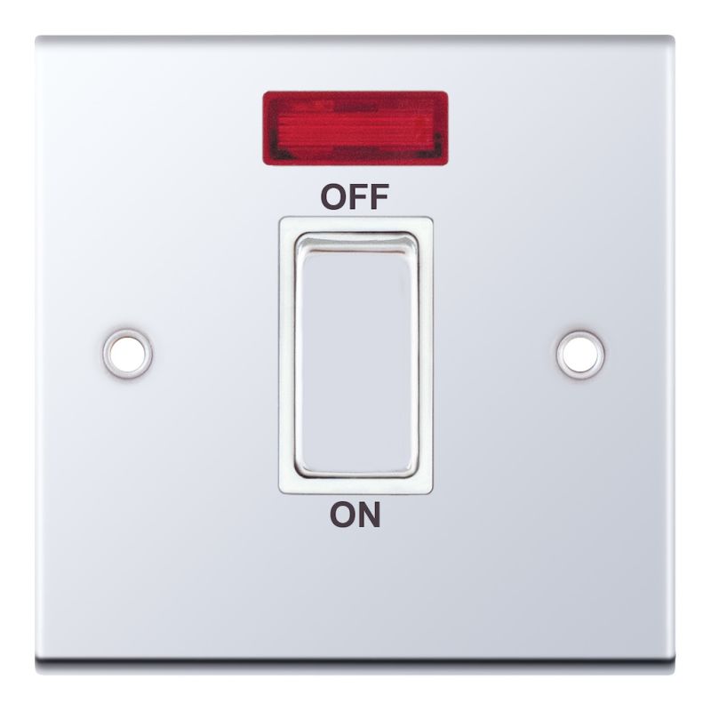 This is the Selectric 45 Amp DP Switch with Neon 1 Gang Plate Polished Chrome White Inserts.