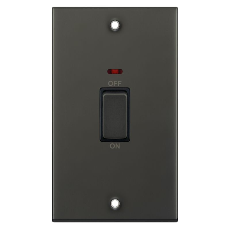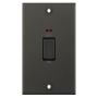 The Selectric 45 Amp Double Pole Switch with Neon on a 2 Gang Plate in dark bronze is a heavy-duty power control designed for high-load appliances. It is ideally suited for domestic, commercial, and industrial equipment requiring higher current ratings, such as cookers and large heater units. The double pole configuration ensures a high level of safety by simultaneously isolating both the live and neutral connections. This model includes an integrated neon indicator for clear power status and an optional cable outlet on the inside of the faceplate for flexible wiring.