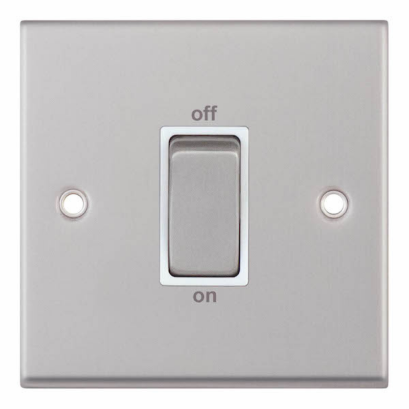 This is the Selectric 45 Amp DP Switch 1 Gang Plate Satin Chrome. Finished in satin chrome, it features a soft-edged metal rocker with a white insert clearly marked “off / on” for easy operation. Designed for reliable high-current switching, it is suitable for both residential and commercial installations.