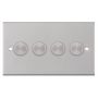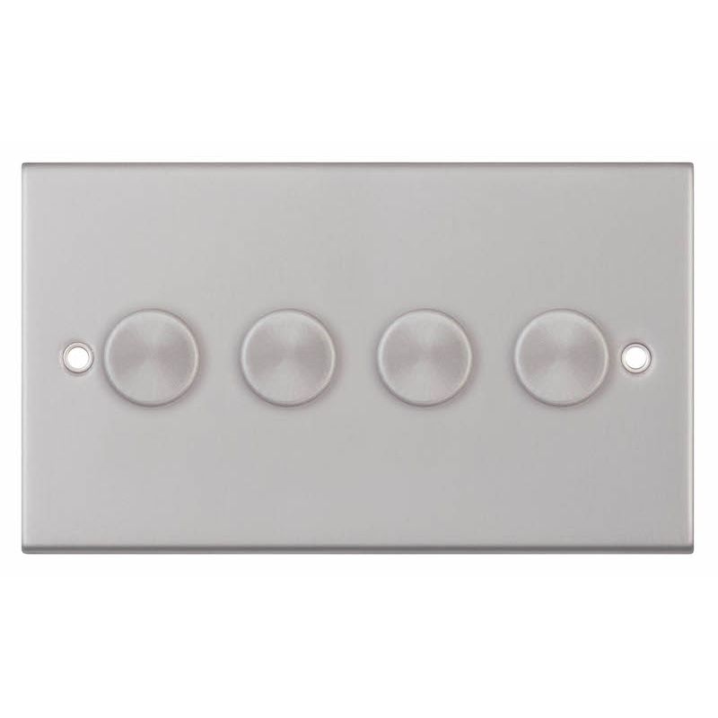 The Selectric 4 Gang 2 Way Dimmer Switch 5–100W Push On/Off in satin chrome combines contemporary styling with advanced dimming performance. Suitable for both leading and trailing edge LED lamps, it supports up to 100W of dimmable LED lighting per gang or 150W incandescent and halogen lamps. Designed for smooth, precise control, it delivers flicker-free dimming even at maximum brightness. Compatible with empty dimmer plates for adding your own module, it requires a minimum 35mm back box for installation.