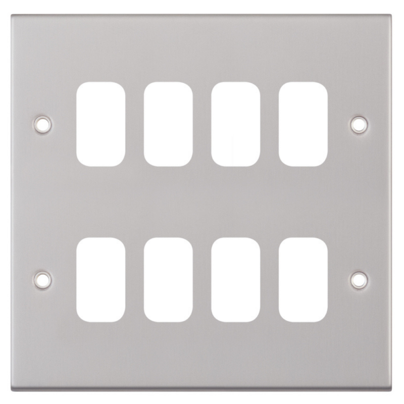 The Selectric 8 Aperture Modular Plate 5M Satin Chrome is designed for use with all Selectric GRID360 modules, offering a versatile and modern solution for larger modular wiring installations. Part of the GRID360 range, it is available in multiple plate finishes with apertures from 1 to 12 to complement all current Selectric ranges. Modules screw directly into the plate for quick and easy installation with no need for yokes, providing a sleek and contemporary finish.