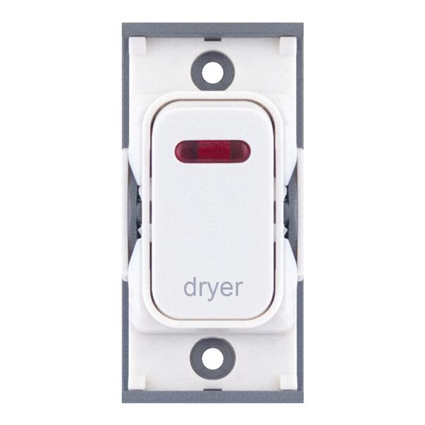 20A double pole modular switch with neon indicator, engraved “Dryer” in white. Provides safe, clearly labelled isolation for tumble dryers within the Selectric GRID360 system.
