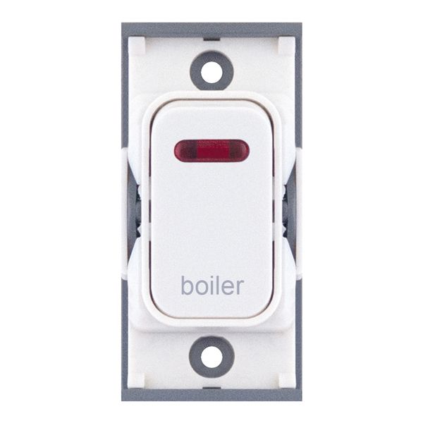 20A double pole modular switch with neon indicator, engraved “Boiler” in white. Designed for safe and clearly identified boiler isolation within the Selectric GRID360 range.