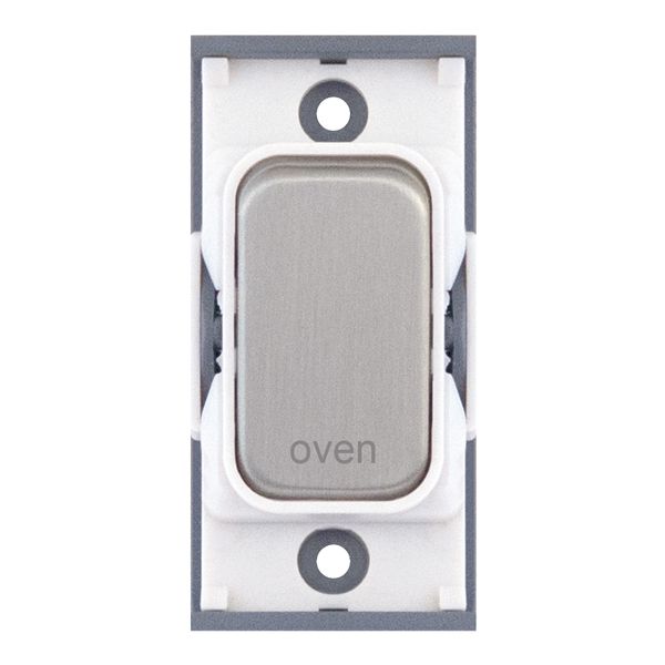 20A double pole modular switch engraved “Oven” in satin chrome with white insert. Designed for safe appliance isolation and compatible with Selectric GRID360 modular plates.