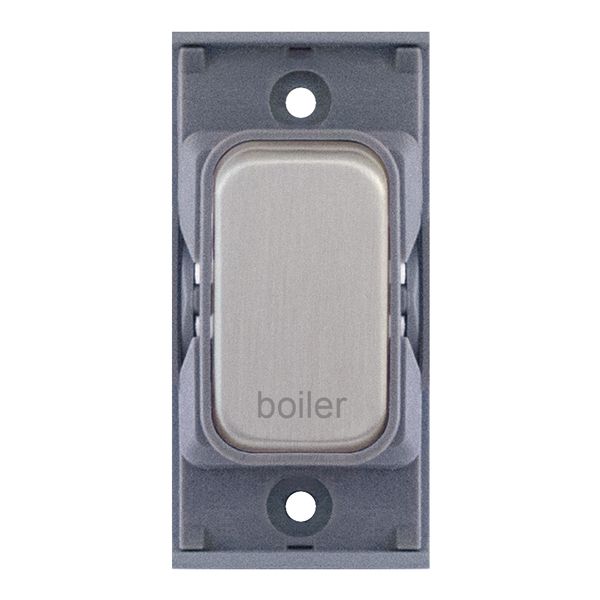 20A double pole modular switch engraved “Boiler” in satin chrome with grey insert. Designed for safe appliance isolation and fully compatible with Selectric GRID360 modular plates.