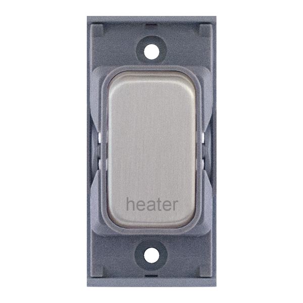 20A double pole modular switch engraved “Heater” in satin chrome with grey insert. Designed for safe appliance isolation and compatible with all Selectric GRID360 modular plates.