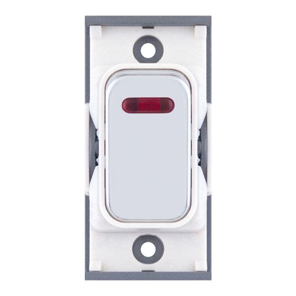 20 Amp double pole modular switch with neon indicator from the Selectric GRID360 range, finished in polished chrome with a white insert. Compatible with all GRID360 modular plates.