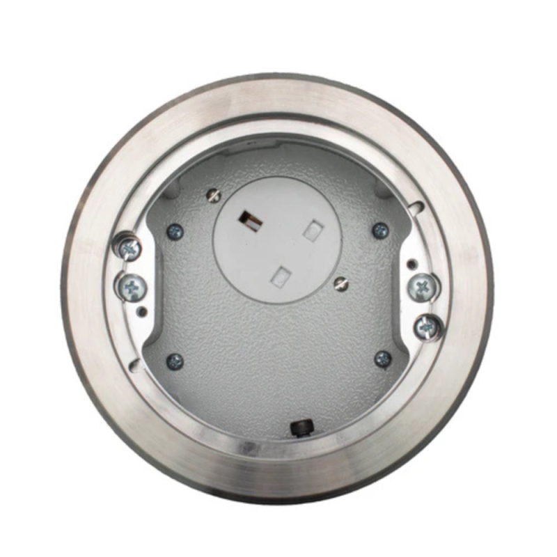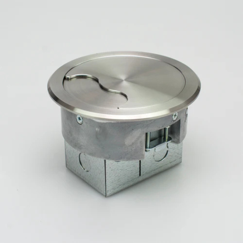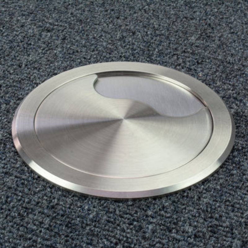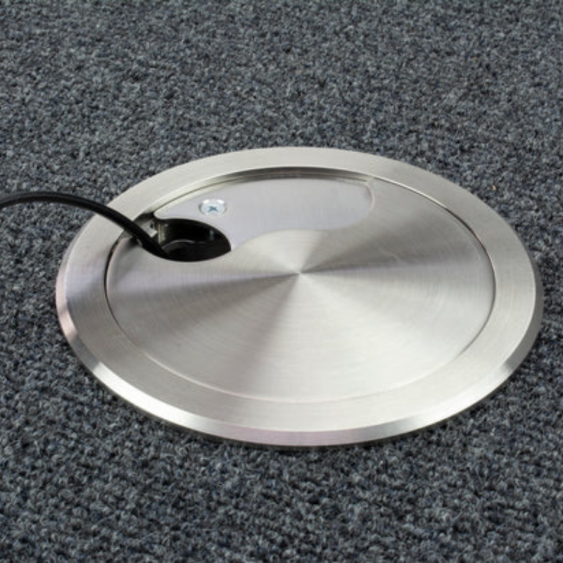 Tass 127mm Stainless Steel Power Grommet, also known as the Cleaners Grommet, is designed for durable power access in commercial environments. Made from stainless steel, the unit must be properly earthed. It features an adjustable cable entry with lid retaining screws for secure use. Not recommended for walkways or areas where it may pose a trip hazard.