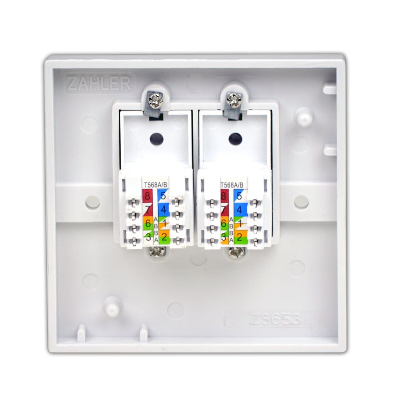 Zahler plain white 2 gang RJ45 socket used to connect computers onto Ethernet-based LAN (Local Area Network).