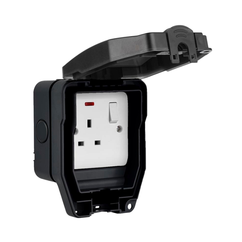 This weatherproof 13A switched socket is twin earth fitted to enable a double earth facility for installation applications that require high integrity protective connections.
