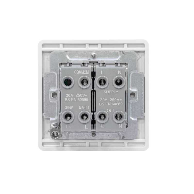 The consumer unit provides a 230/240 volt AC live supply to the input side of the dual immersion heater switch (the one with "On" and "Off" markings). On the output side of the main DP isolating switch, there is a pre-wired connection that goes to the common terminal of either the "Sink" or "Bath" switch. When either of these switches is turned on, it sends a live feed to the corresponding terminals for the Sink or Bath supply cables on the dual immersion heater switch. The neutral wire from the dual immersion heater switch is directly connected to the neutral terminal on the input side of the main isolating switch.