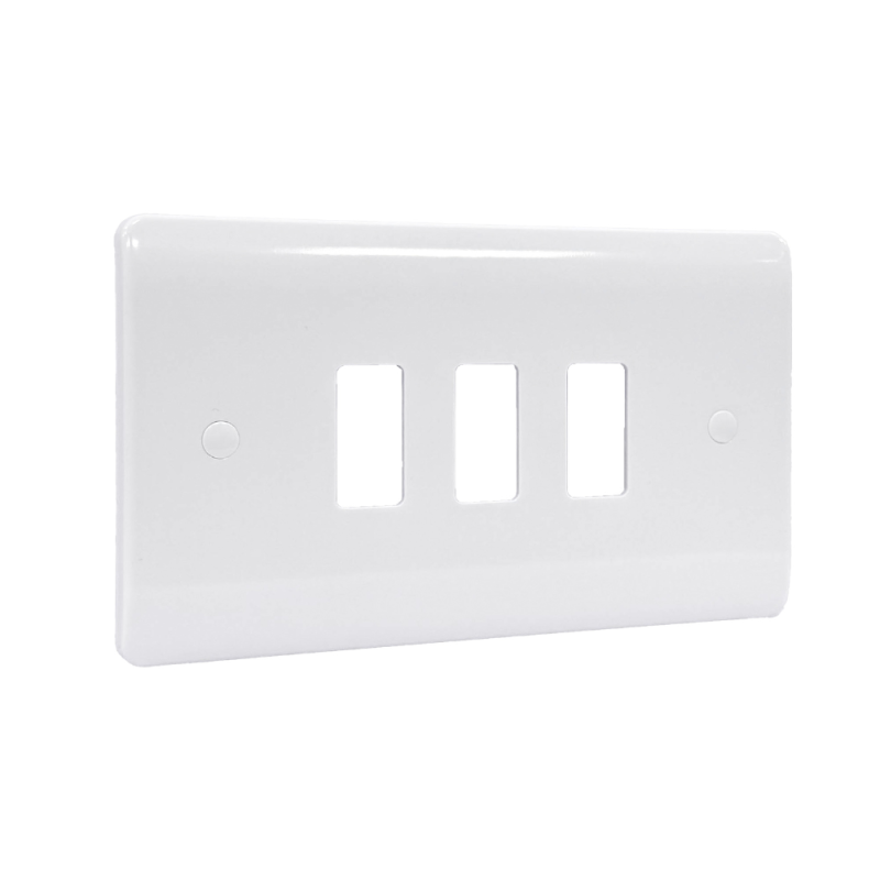 This is the Zahler 3 Aperture 2 Gang Grid Plate. We carry a large selection of Zahler switches, sockets, plugs, and other electrical supplies. Shop here!