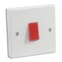 White 45 amp 1 gang single plate double pole cooker switch with red rocker marked OFF/ON.