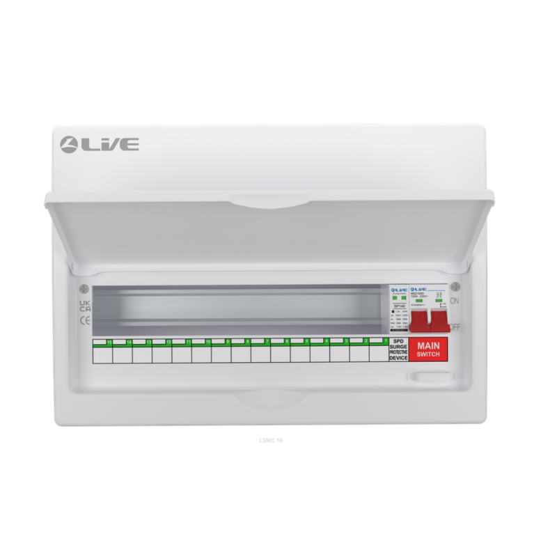 This is the Live 18 Module Metal Consumer Unit with 100A Main Switch and 20/40kA Double Pole Surge Protection Device (SPD). It is designed to provide safe and efficient electrical distribution in residential and light commercial installations.