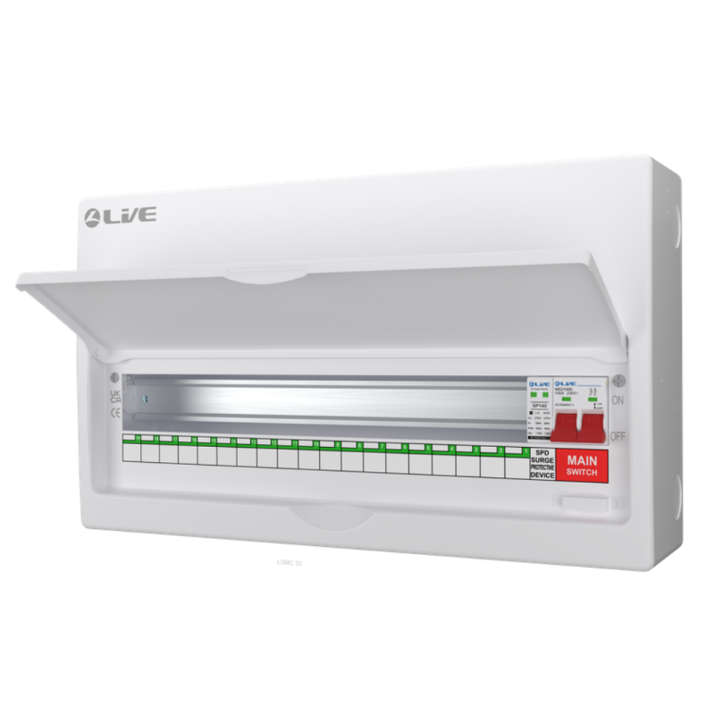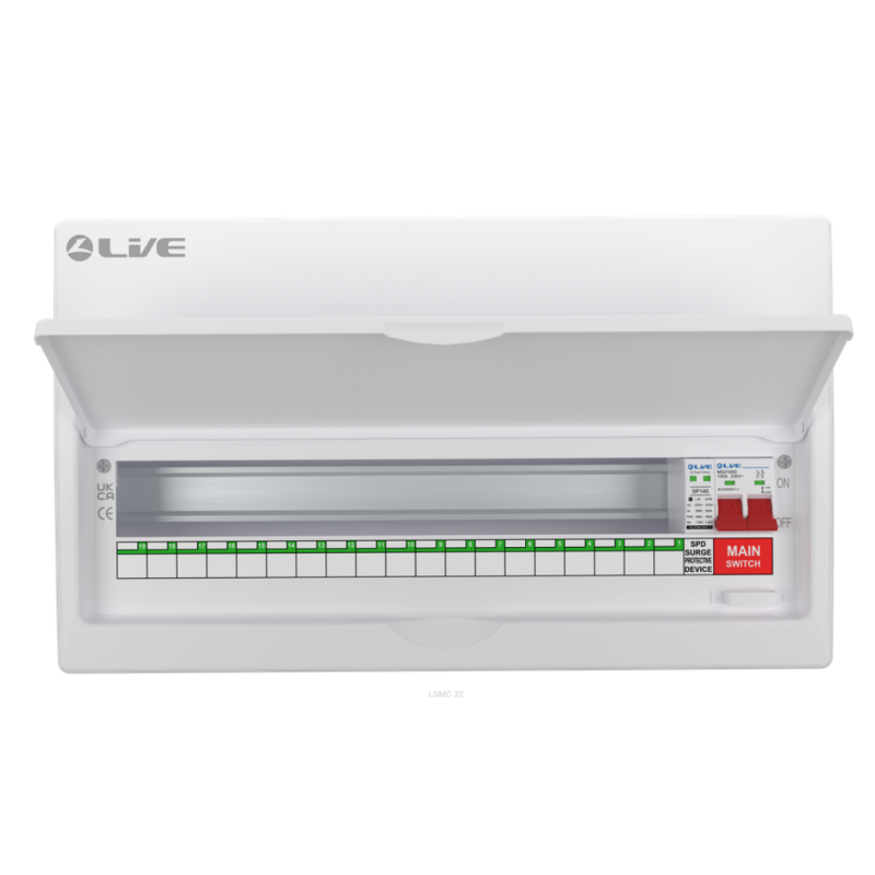 This is the Live 22 Module Metal Consumer Unit with 100A Main Switch and 20/40kA Double Pole Surge Protection Device (SPD). It is designed to provide safe and efficient electrical distribution in residential and light commercial installations.