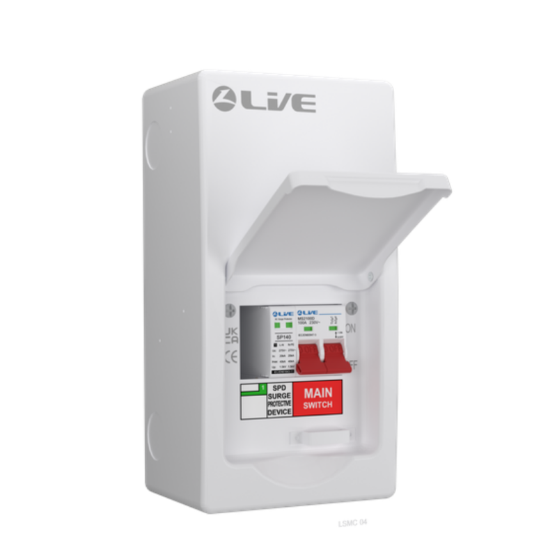 This is the Live 4 Module Metal Consumer Unit with 100A Main Switch and 20/40kA Double Pole Surge Protection Device (SPD). It is designed to provide safe and efficient electrical distribution in residential and light commercial installations.