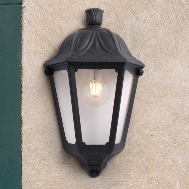 This half lantern in classic style features an E27 lampholder and is crafted from shockproof resin material, UV-ray stabilized, and resistant to rust and corrosion for lasting durability. With an insulation class II rating and a protection rating of IP55, it is designed to perform reliably in outdoor environments, offering both style and functionality.
